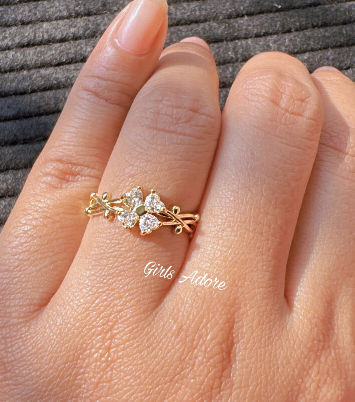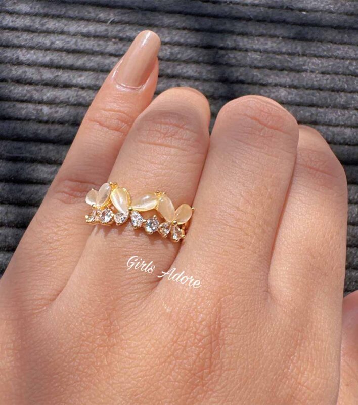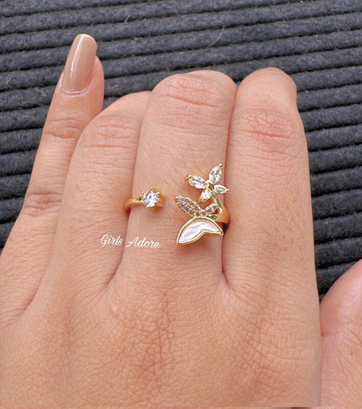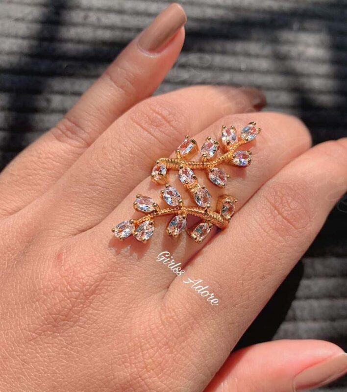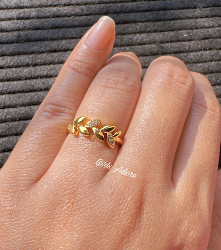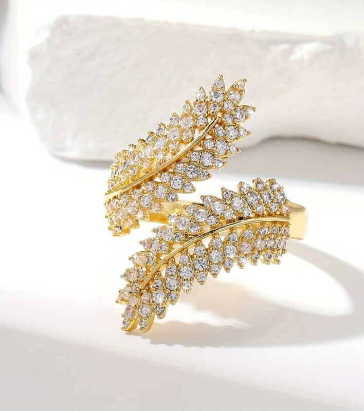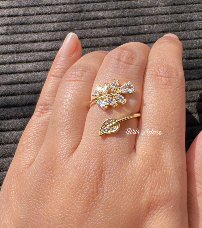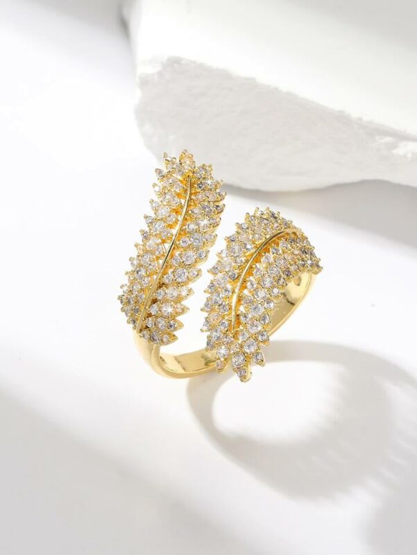 Gold-Plated Adjustable Leaf Design Ring with Sparkling Stones