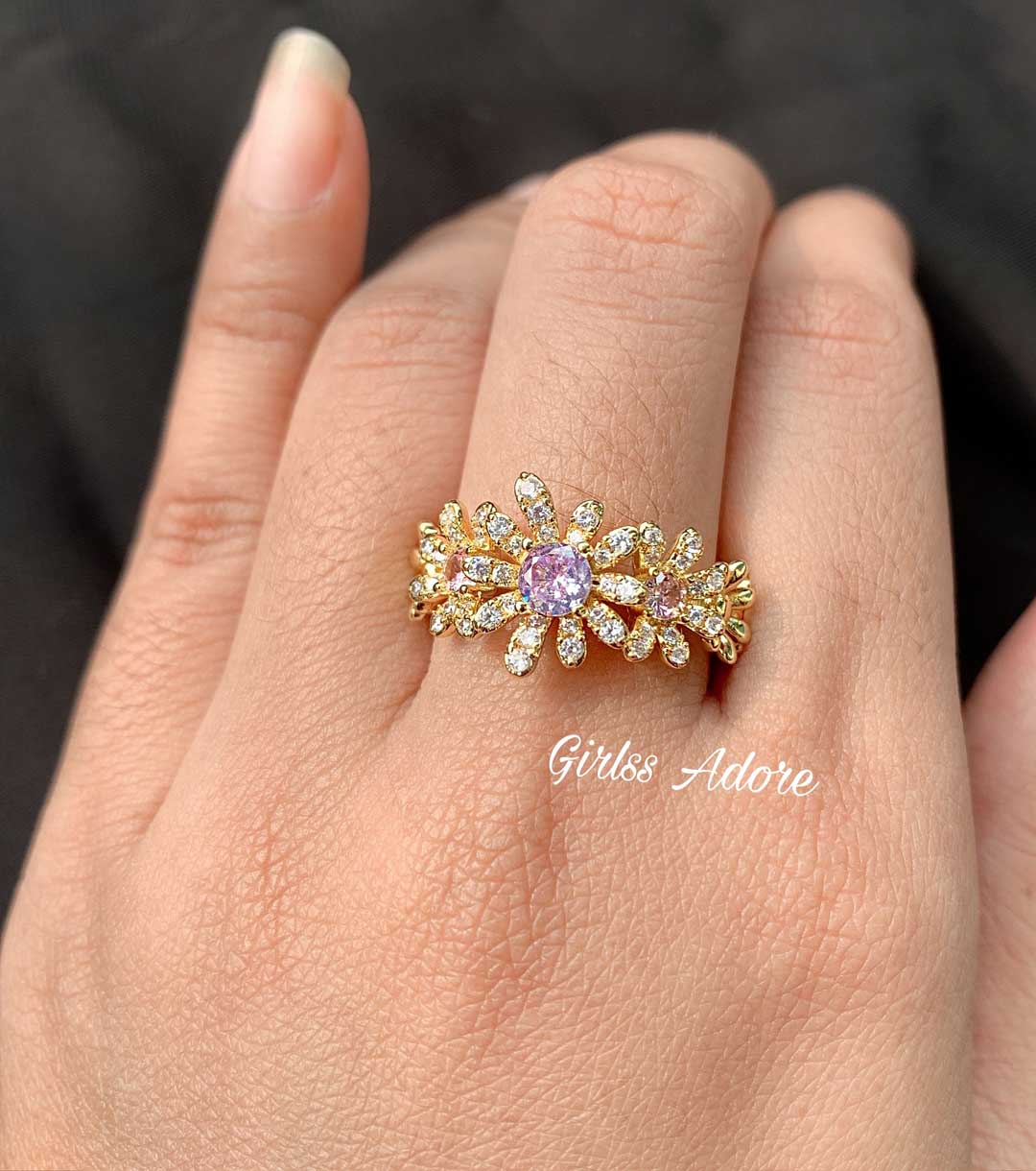 Add a touch of charm and sparkle with this beautifully designed daisy-inspired ring. Featuring a radiant pink crystal at the center surrounded by shimmering white stones and delicate accents, this ring brings a fresh and graceful floral look to your style.