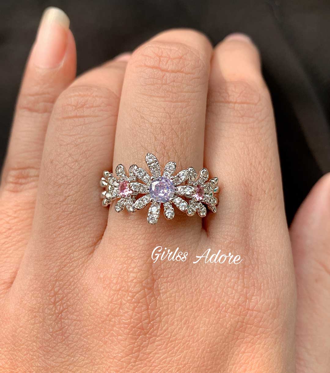 Embrace elegance with this charming daisy-inspired ring, featuring sparkling petals adorned with white stones and a captivating purple center stone. Two delicate pink side stones add a touch of color and romance, making this piece truly unique. Its floral design symbolizes beauty and joy, making it a perfect accessory for any occasion.