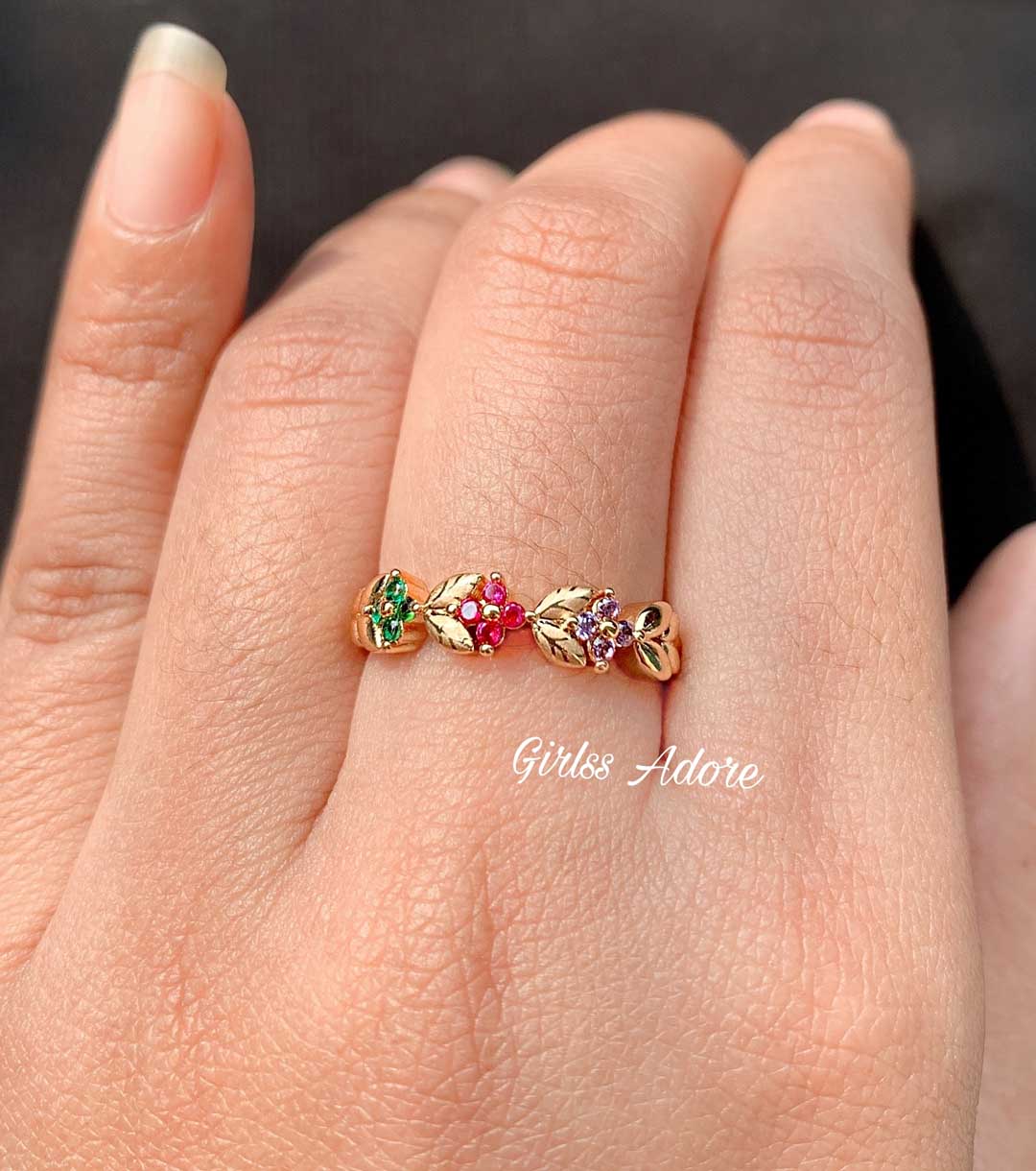 Add a playful yet elegant touch to your jewelry collection with this beautiful floral ring. Designed with a golden base, it features delicate leaf details and vibrant stones in green, pink, and purple, arranged to create a charming floral look. Perfect for everyday wear or as a thoughtful gift for someone special.