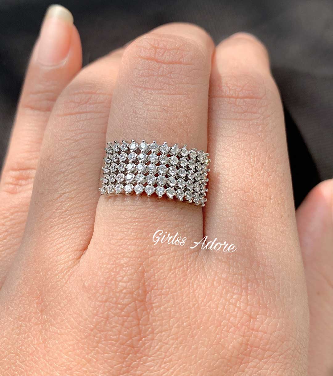 Shine with timeless sophistication in this wide crystal-studded band ring. Crafted with a sleek silver finish, it features multiple rows of sparkling stones that create a luxurious and radiant look. Perfect for parties, weddings, or daily wear to add a touch of glamour to any outfit. ✔️ Premium Quality & Sparkling Finish ✔️ Adjustable Size – Perfect Fit for All ✔️ Comfortable, Lightweight & Durable A versatile must-have accessory for women who love chic and elegant jewelry.