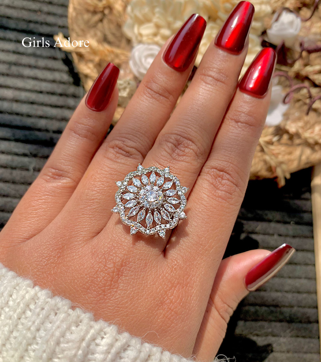 Upgrade your style with this stunning premium adjustable finger ring. Designed with sparkling crystal stones and luxury leaf detailing, this ring gives a classy and elegant look. Comfortable fit and adjustable sizing makes it perfect for all finger sizes.