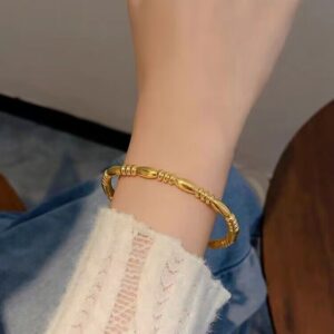 The Taiyeba Gold Bangle is designed to add a touch of elegance and charm to your look. Featuring a beautiful twisted gold-finish design with delicate floral stone settings, this bangle offers a premium and sophisticated appearance.